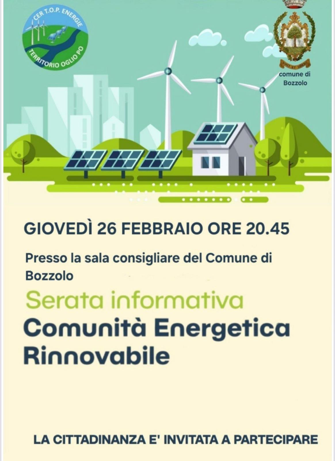 Giovedì prossimo, 26 febbraio, alle 20:45 si terrà presso la sala consiliare di Bozzolo un importante incontro di presentazione della comunità energetica solidale del territorio..